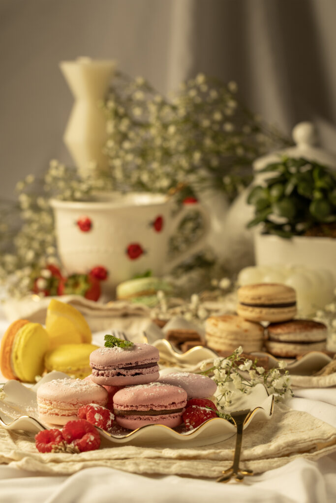 A soft, elegant food photography composition presenting French macarons with fresh berries and delicate props, creating a warm dessert atmosphere.